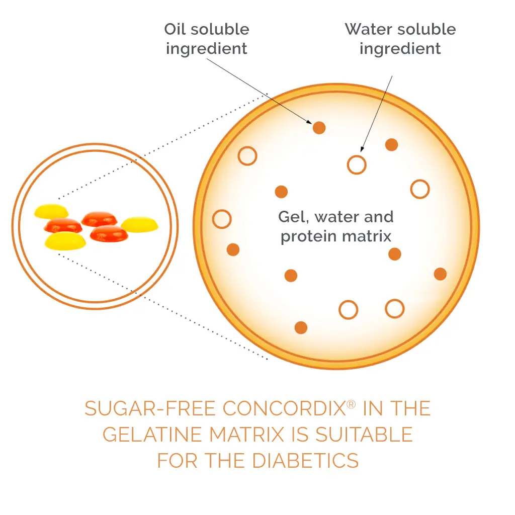 ConCordix® is a technology developed to mirror the way we naturally take our nutrients which starts with chewing. The ConCordix Smart Chews mirror the structure of food by fixating billions of small droplets in the gelatin matrix increasing the the contact surface area which enhances the absorbtion of active ingrdients into the body. The ConCordix technology was developed through joint R&D studies with Norwegian University of Science and Technology (NTNU). It is a patented method that combines fatty acids with water- and fat-soluble vitamins and minerals in an emulsion format.